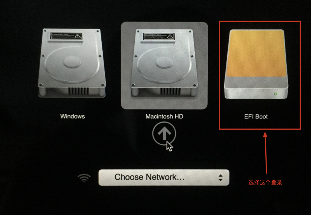 1.登录系统,开机后一直按“option”键,就会出现下图: