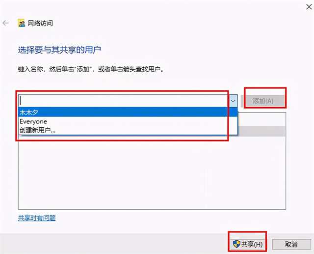 3、 选择一个共享用户(这个用户是用来跨设备访问时登陆验证的),也可以选择新建一个用户,我这里就选择【木木夕】这个用户,点击【添加】,然后点击【共享】。