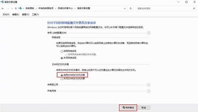 3、展开【专用】,然后选中【启用文件和打印机共享】,点击【保存更改】。