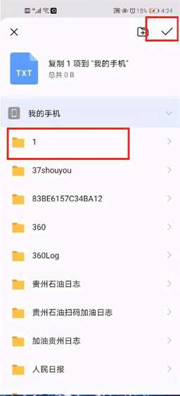 6、比如选文件夹【1】,然后点击上面【✓】确认,就开始复制了,速度非常很快的。