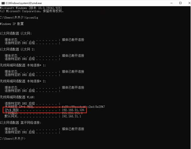 2、输入ipconfig,查看本机的IP地址,因为我这边连的无线网,所以找到下面的无线局域网适配器,ipv4就是电脑的IP地址:192.168.31.126。