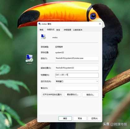 右键单击桌面上的远程桌面连接快捷方式,然后选择属性。