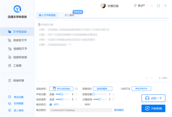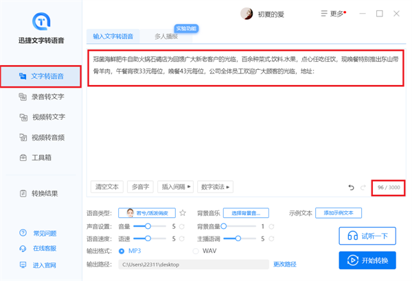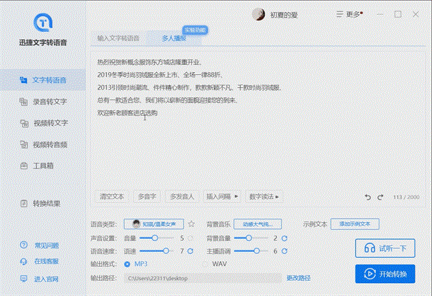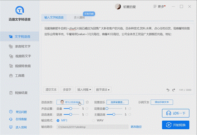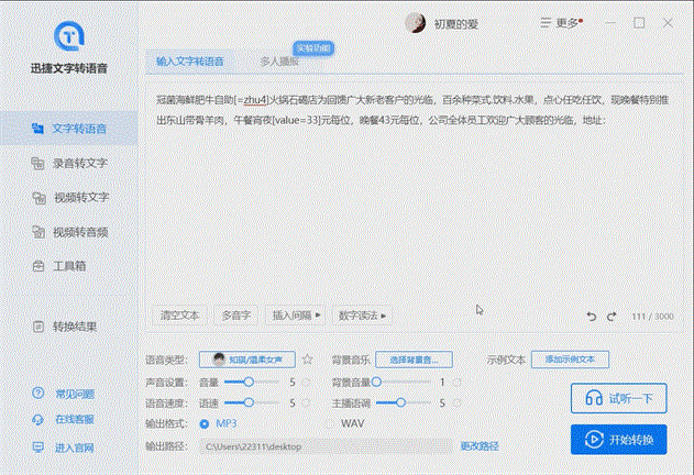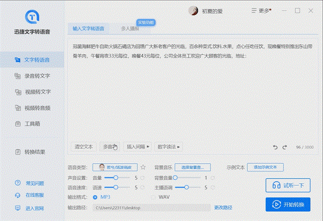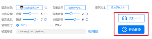多音字、数字、主播配音和背景音乐,都设置好之后,我们就可以试听一下,如果没有问题就可以直接将文字转换成语音。