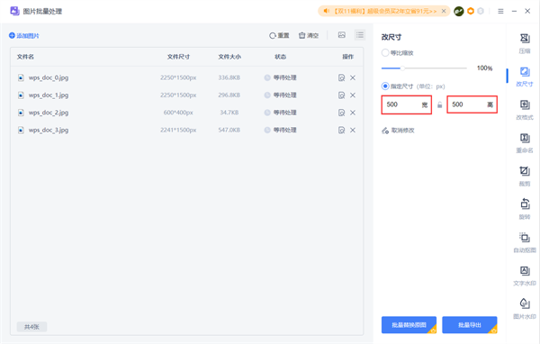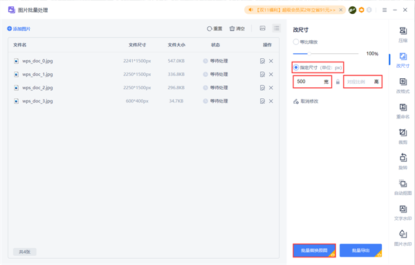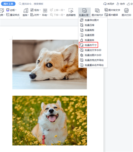 2 在“批量处理”下拉列表中选择“批量改尺寸”。