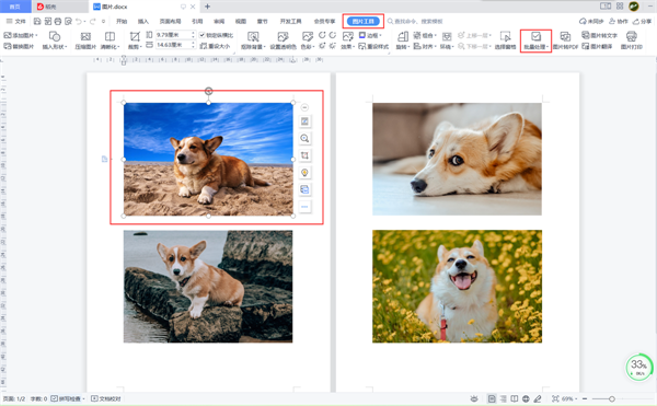 1 单击选中文档中任意一张图片,在“图片工具”选项卡下单击“批量处理”按钮。