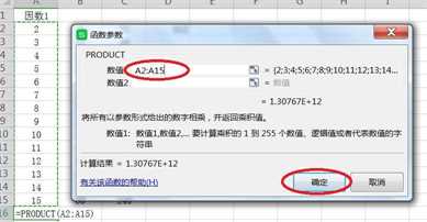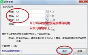 3、这时候就出现了输入函数参数的窗口了,窗口中的“数值1,数值2,数值3……”就是因数所对应的单元格编号了!我只需要一次点击对应的因数单元格就OK了,最后点击“确定”就可以求出乘积了!