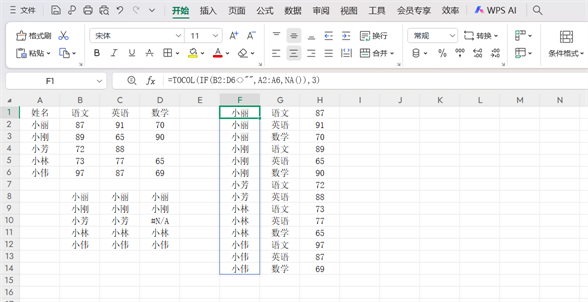 =LET(x,B2:D6,y,A2:A6,z,B1:D1,VSTACK({“姓名”,”科目”,”成绩”},HSTACK(TOCOL(IF(x<>””,y,NA()),3),TOCOL(IF(x<>””,z,NA()),3),TOCOL(x,3))))。