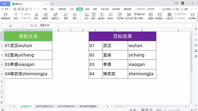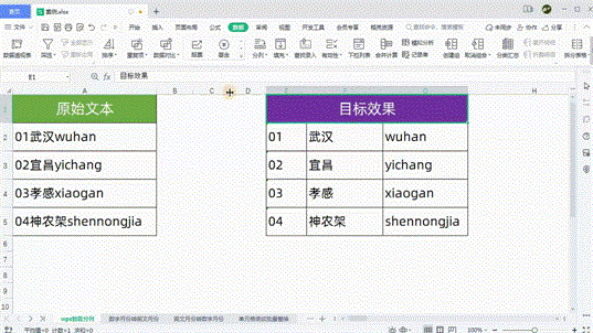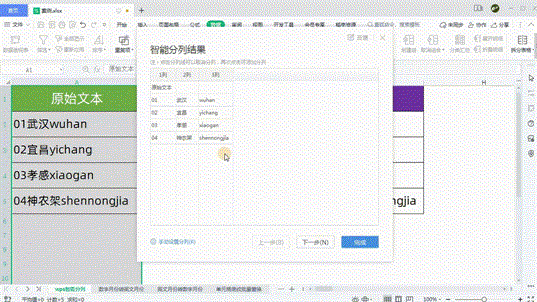 最佳答案选中原始文本列。在数据选项卡下单击分列按钮右侧的倒三角,在弹出的列表中选择智能分列,接下来可以在智能分列结果对话框中预览分列结果。可以看到数字中文城市名和英文城市名已经分别拆分为不同的列,我们直接单击完成。接下来在弹出的对话框中单击是,就可以快速实现我们想要的拆分效果,是不是非常方便呢?视频教程:......