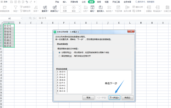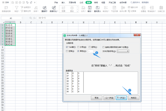 2、在打开的分列向导页面上,单击 下一步,选择“其他”在框内输入横线“-”,单击 完成。