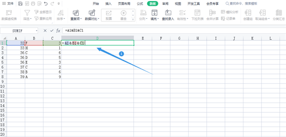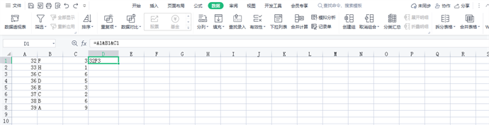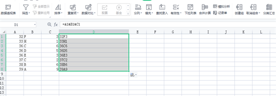 5、分列后的内容做完排序后,选中单元格D1,输入“=”再输入“A1&B1&C1”将分列的内容用“&”连接起来,按Enter键鼠标放在选框右下角,变成黑色“ ”时 向下拖动自动填充单元格内容。