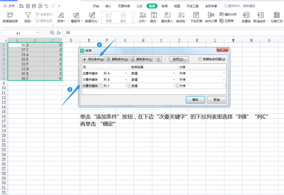 弹出排序页面,单击“添加条件”按钮,在下边的“次要关键字”的下拉列表里选择“列B”“列C”,单击确定。