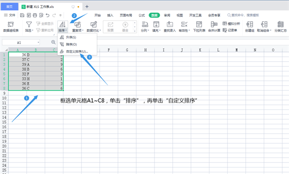 3、框选单元格A1~C8,单击“排序”-“自定义排序”。