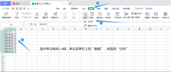 1、新建一个空白的表格,输入文字和字母。选中单元格A1~A8,单击菜单栏上的“数据”,再选择“分列”