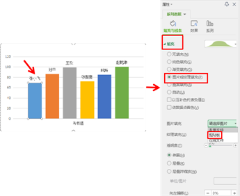 选中形状,快捷键”Ctrl+c”复制,选中一个柱形,快捷键”Ctrl+1″,填充与线条—图案或纹理填充—图片填充—剪贴板。