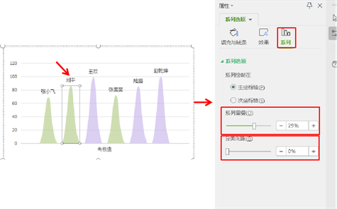选中其中一个山峰,快捷键”Ctrl+1″,选择”系列”,系列重叠”29%”,分类间距”0″。