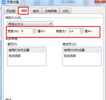 三、再然后在【页面设置】窗口中选择【纸张】,将纸张大小设置为自定义大小。将宽度设置【9】厘米,高度设置【5.4厘米】(这个数据是名片大小的基本数据。)
