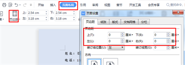 二、然后,单击【页面布局】——【页边距】,弹出的页面设置窗口中,将页边距的上下左右都设置为【0厘米】;