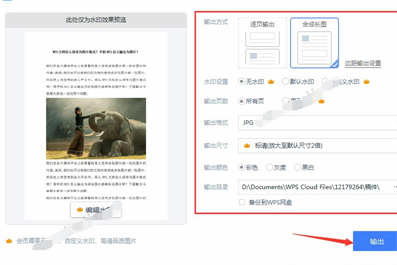 第二步:在“输出为图片”中选择输出方式(逐页输出或合成长图,还可以点击“边距输出设置”进行页间距、上下边距设置)、水印设置(无水印、默认水印和自定义水印)、输出页数(所有页、页码选择)、输出格式(JPG、PNG、BMP、TIF)、输出尺寸、颜色及目录等,没有问题后点击【输出】按钮即可将该WPS文档保存为图片保存到“输出目录”中。