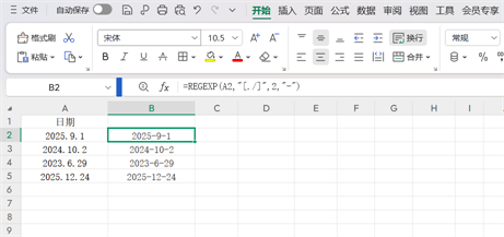 统一日期分隔符时,=REGEXP(A2,”[./]”,2,”-“)能将“2025.09.1”转换为“2025-9-1”,高效实现格式统一。