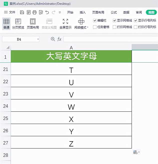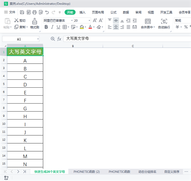 2 将A2单元格中的公式向下填充至A27单元格,即可快速得到B-Z等其他大写英文字母。(数字代码66-90依次代表大写字母B-Z)