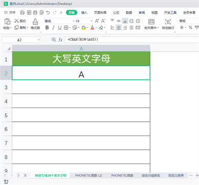 1 选中A2单元格,在英文状态下输入公式:=CHAR(ROW(A65)),回车确认公式,即可返回第一个英文字母A。