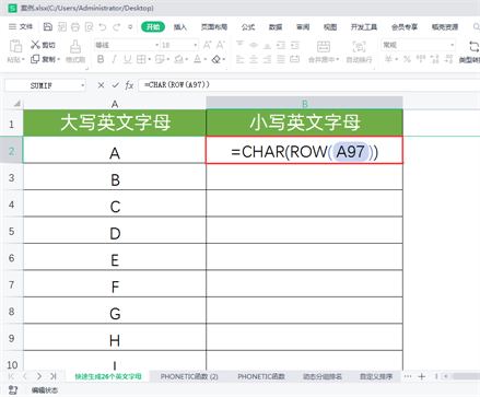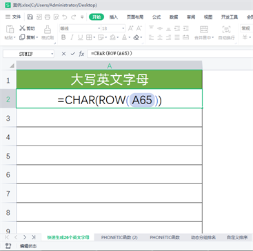 公式说明:ROW(A65)可返回A65所在单元格的行号65,CHAR函数可将计算机中的数字代码转换成其所代表的字符,数字65代表的字符正是大写字母A,所以CHAR(65)可以返回大写字母A。