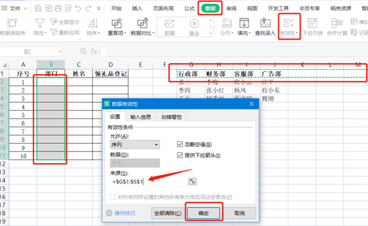首先选中部门所在列——点击【数据】——【数据有效性】——选中【序列】——点击【来源】——点击【确定】
