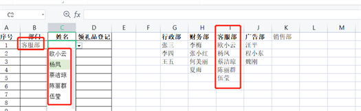 3、这个时候,我们试试看我们刚刚做的动态二级菜单。选择客服部——在姓名里查看一下是不是(欧小云、杨凤…)如下图。