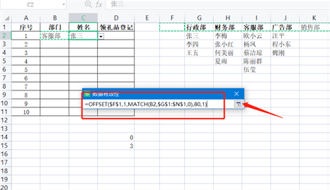 =OFFSET($F$1,1,MATCH(B2,$G$1:$N$1,0),80,1),将这个函数复制到来源里边即可,如下图。这里边的一定要绝对引用,如果函数不会的同学,可以自行查找相关用法,也可以在本站搜索关键词了解。