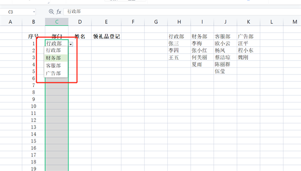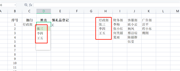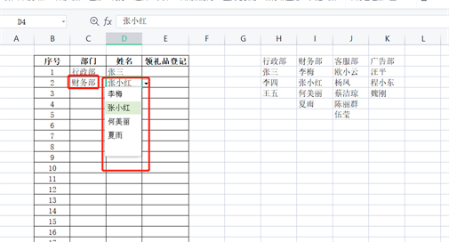 例如下面的这张表,我们在部门里选择之后,对应的姓名就是这个部门的人,而不是其他部门的人。这个就是级联下拉式菜单。