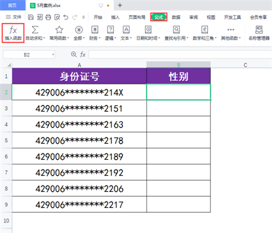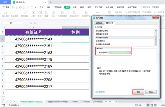 最佳答案操作步骤1 选中B2单元格,在“公式”选项卡下单击“插入函数”按钮。2 在打开的“插入函数”对话框中,切换到“常用公式”选项卡,在“公式列表”中选择“提取身份证性别”。3 选择“提取身份证性别”后,将光标定位在“参数输入”下面的“身份证号码”编辑框中,再单击A2单元格,也就是第一个身份证号所在的单元......