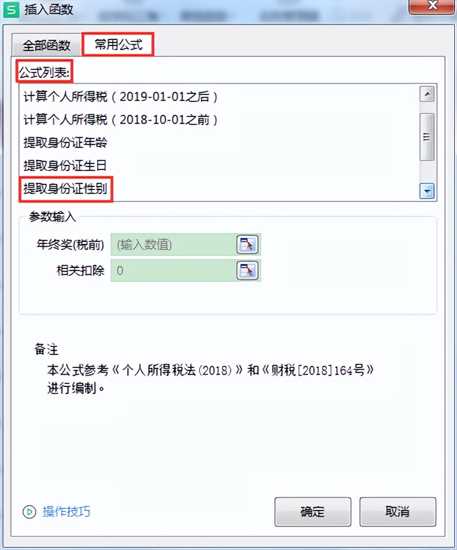 2 在打开的“插入函数”对话框中,切换到“常用公式”选项卡,在“公式列表”中选择“提取身份证性别”。