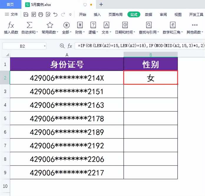 4 此时,B2单元格中会返回第一个身份证号对应的性别“女”。