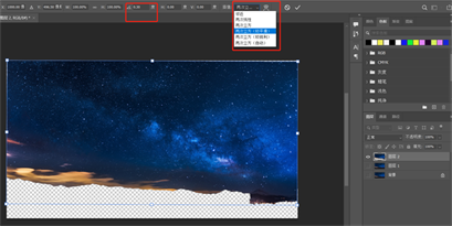 第二步:点击复制的天空图层,按:ctrl+t,把角度改为0.3,把插值设置为:两次立方(较平滑),设置好之后,点击旁边的勾。