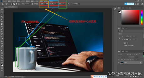 今天的最后一个套索工具是磁性套索工具,磁性就是自动吸附,首先给一点开始,然后通过移动鼠标使其在我们鼠标经过时进行吸附,最后再回到我们刚开始的地方点击鼠标左键使其现成环闭选区,当然这个也是和前面学习的选区工具是一样的。在这里我们在属性栏会发现比前面两个工具多了三个属性,我们先来看一看第一个宽度,这个调节的是我们鼠标在选区时在工作台上面显示的小圆圈的宽度,在使用中尽量调节小一点。第二个是对比度,对比度就是调节我们需要框选的颜色对其他进行对比,调高一点误差小一点。最后 一个频率就是我们使用工具时的小点出现的频率,在我们平时使用时设置在70到80之间即可。如图所示