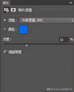 接着在“照片滤镜 1 ”图层的“滤镜调整”面板,设置(滤镜:冷却滤镜(80)、浓度:33%)